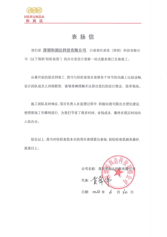 非常开心能够收到来自和润达的推荐信,同时也非常感谢对轻松海角官网首页登录入口办公室HJ08海角社区免费版APP、施工团队的肯定。